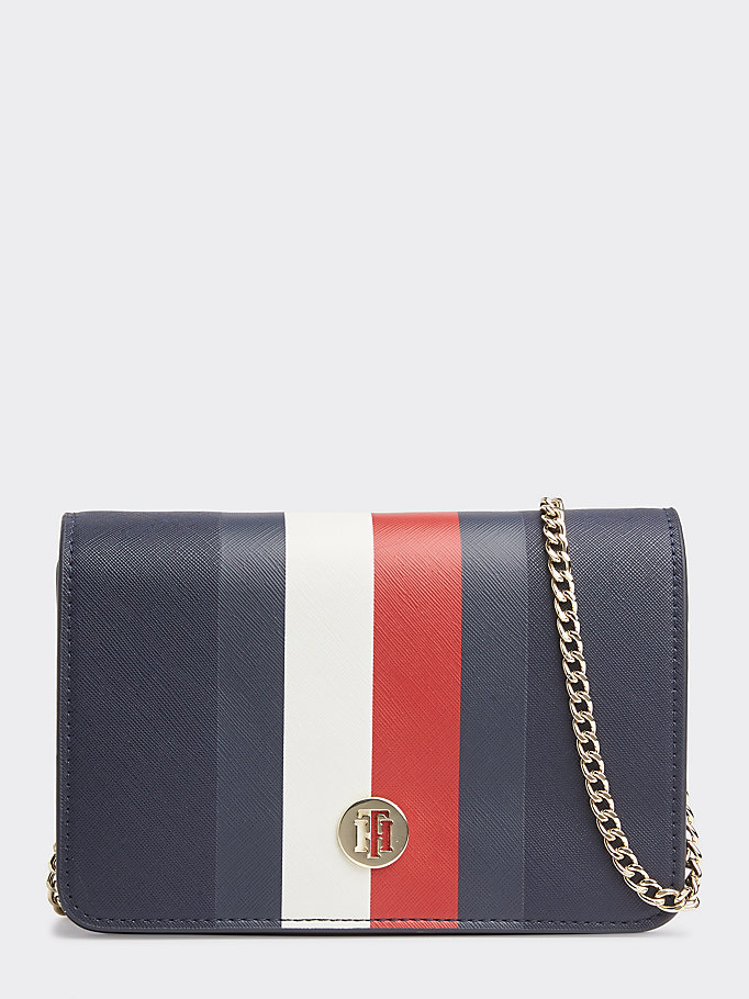 Deze elegante crossbodytas met signature-tape op de flap heeft een goudkleurige afneembare schouderketting als finishing touch.
