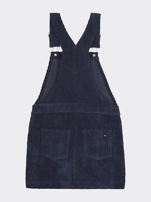 Deze stoere dungaree-jurk van zacht corduroy met verstelbare bandjes en subtiele branding is vrijwel overal mee te combineren.