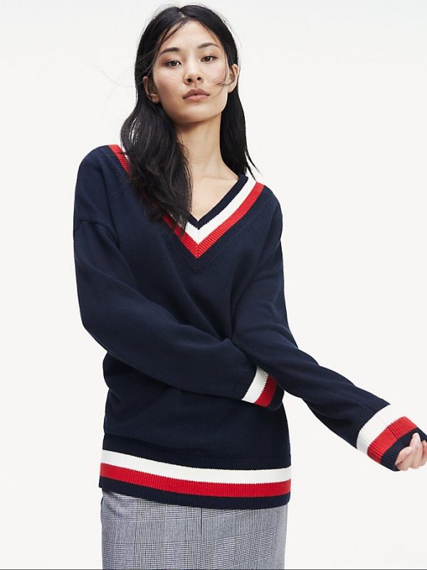 Sportief, comfortabel en vintage komen samen in deze casual colour-blocked trui met V-hals.