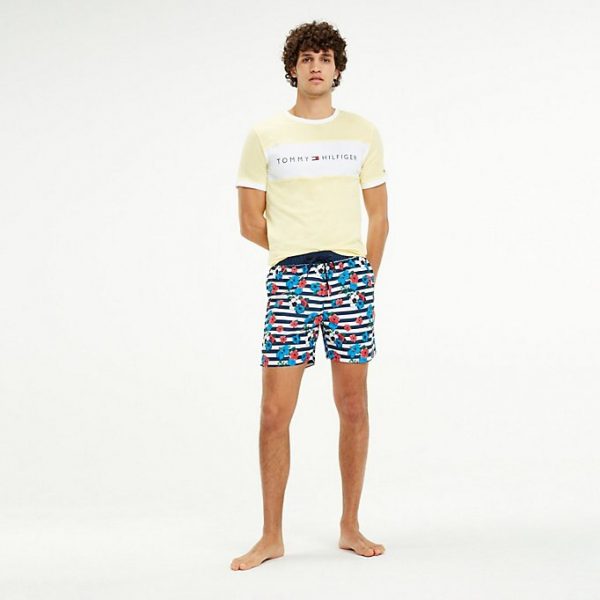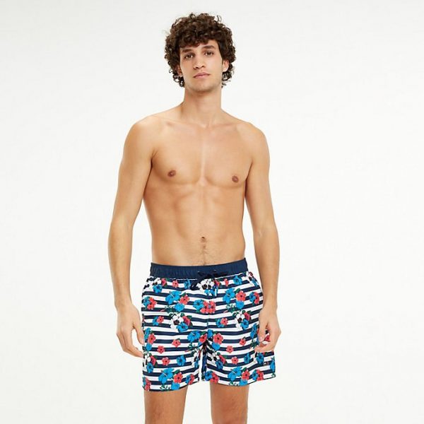 Deze zwemshort met klassieke marinestrepen krijgt een tropicana update door de print met Hawaïaanse bloemen.