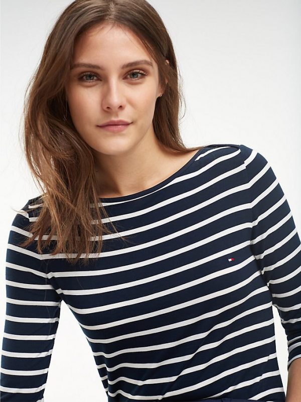 Dit gestreepte T-shirt met een brede boothals en driekwartmouwen combineert sportief en tijdloos elegant.