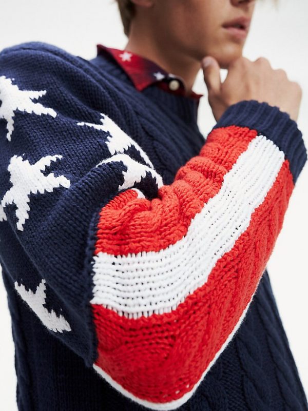 Het stars and stripes-ontwerp op de arm geeft deze kabeltrui een onmiskenbare all-American vibe.