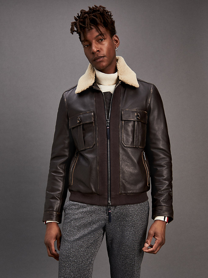 Dit vintage-inspired pilotenjack van zacht leer heeft een comfortabele kraag van scheerwol en een praktische tweeweg-ritssluiting.