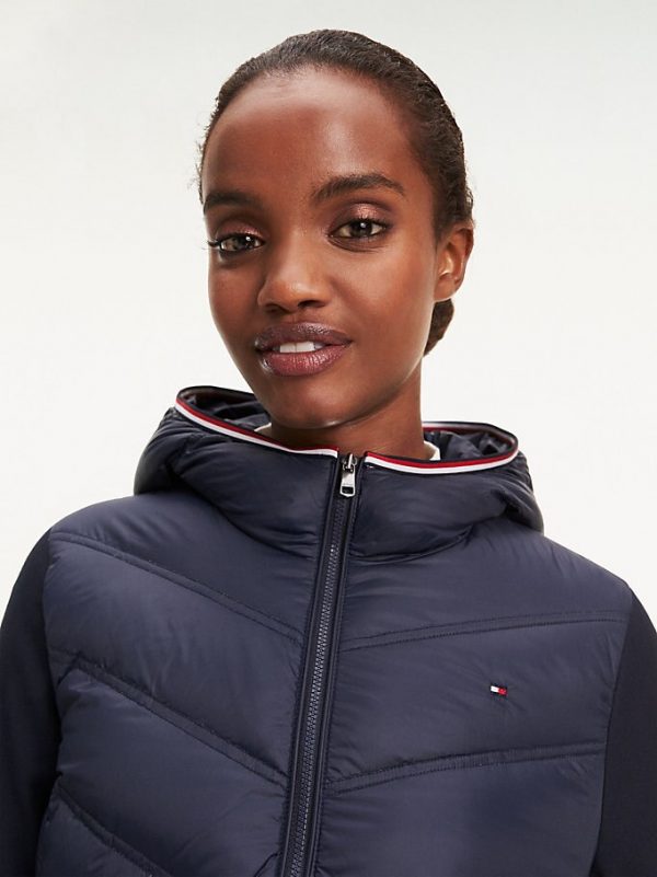 In deze gewatteerde jas met contrasterende mouwen van scubastof ben je stijlvol gewapend tegen de kou.