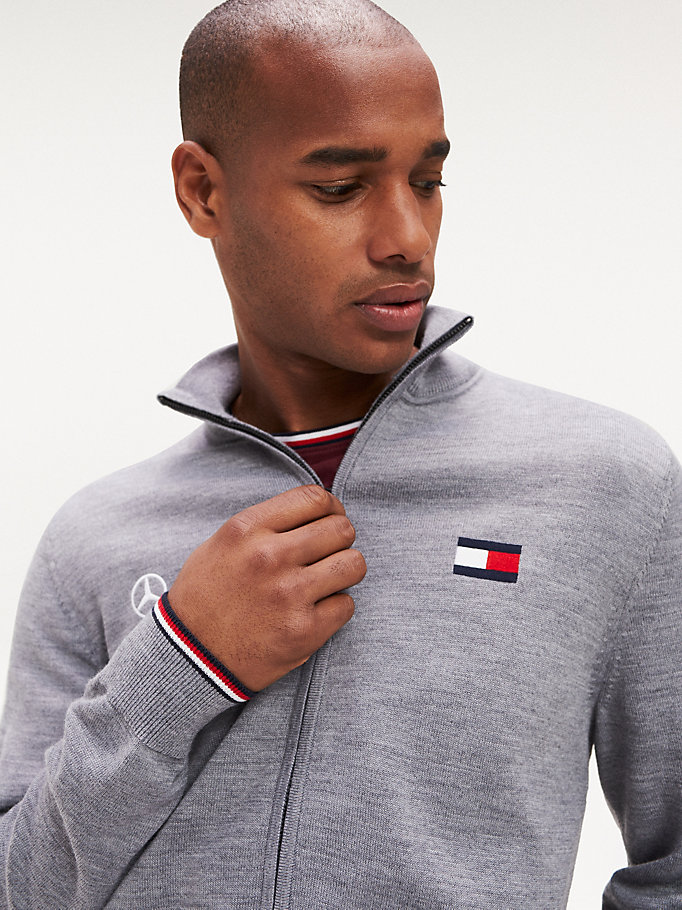 Voel je helemaal thuis in de racing-wereld met dit warme wollen vest met rits en opstaande kraag uit de Mercedes Benz-collectie.