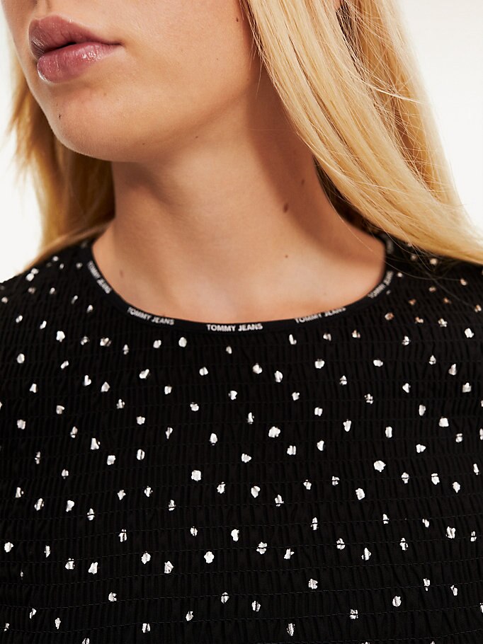 Deze charmante midi-jurk met all-over polkadotprint en herhalend logo langs de halslijn is perfect voor je volgende feestje.