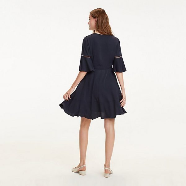Bohemien meets cool in deze mini-jurk met uitlopende mouwen, hoge taille en diepe V-hals.