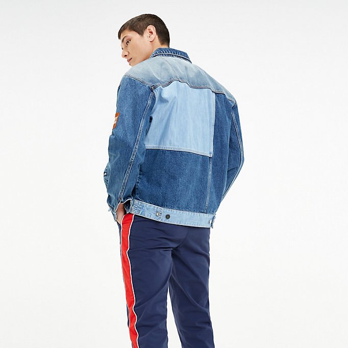 Geef je garderobe een update met dit oversized truckerjack met vakken van hergebruikt denim en knopen voor een retro uitstraling.