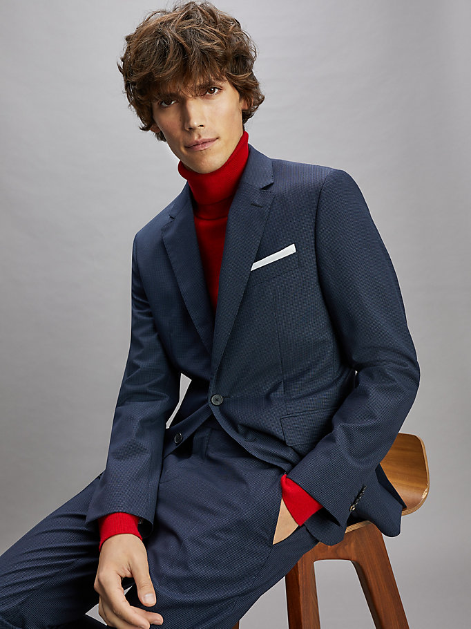 De revers met inkeping en contrasterende voering onder de kraag geven dit pak van zuivere scheerwol een classy accent.
