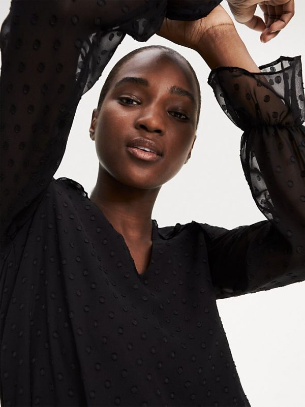 Deze luxe blouse met all-over dobbystip, ruches en semi-transparante mouwen is op en top vrouwelijk.