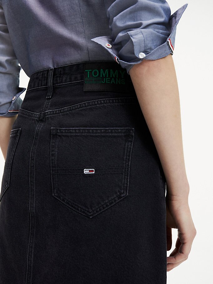 Deze edgy rok van gerecycled denim valt op door de lengte en stoere signature-details.