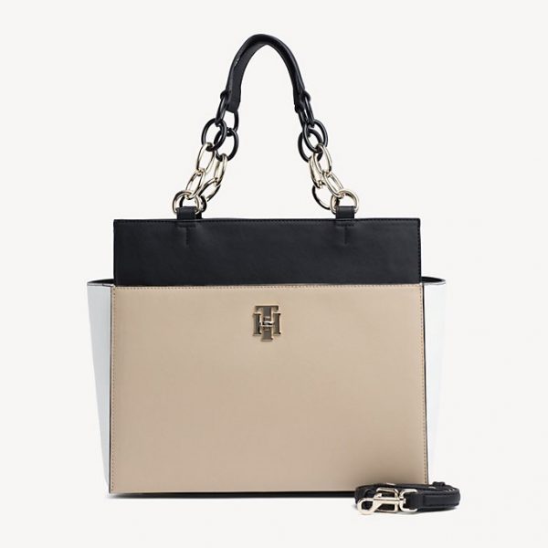 Deze elegante handtas met handige vakken en handvatten met kettingdetail is net zo praktisch als stylish.
