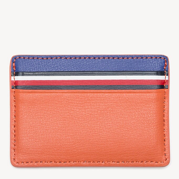 Beken dit seizoen kleur met deze gestroomlijnde kaarthouder van leer, met een rand van signature-tape.