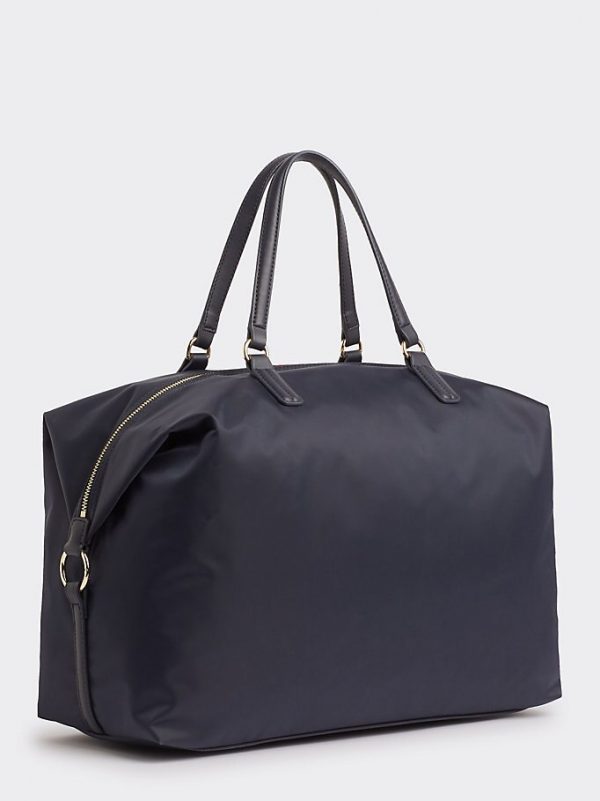 Deze weekendtas met signature-tape is ruim genoeg voor al je essentials en heeft handige zijvakken voor je sleutels en make-up.