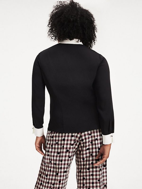 De goudkleurige knopen en contrasterende kraag maken van deze elegante blouse een echte eye-catcher.