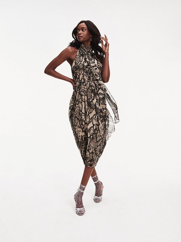 Deze jurk met stijlvolle slangenprint en elegante halternek heeft een striksluiting in de taille om je figuur te accentueren.